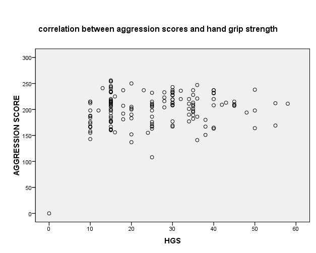 Students diagnosed with medical or surgical condition, muscular disorder, hand pain or arthritis as per history. Hand grip strength assessed by Handgrip Dynamometry (In co Ambala, India). The students were asked to hold the dynamometer with dominant hand in standing position with shoulder adducted & neutrally rotated & elbow in full extension. It was held freely without support not touching subject’s trunk. The position of the hand remained constant. The subjects were asked to put maximum force on the dynamometer & hold it for 3 seconds, the maximum value was recorded in kilograms. Aggression was assessed by Aggression Scale by G P Mathur and Bhatnagar. Each statement describes different forms of individual's aggression in different situations. It is a 55 item self report questionnaire with 5 point likert scale. It consists of 55 statements, 30 statements are positive and 25 statements are in negative form. Subject responses are measured on a five-point scale. In positive form score was given as 5, 4, 3, 2, 1 respectively and in negative form of statement scores was given as 1, 2, 3, 4, 5 respectively. The total score will be calculated by adding all the scores of individual items. The participants were informed everything about the aggression scale. There is no right and wrong response to the statement. No time limit was fixed for the test but usually an individual takes 25 to 30 minutes to complete this test. But it was compulsory to respond to each question.